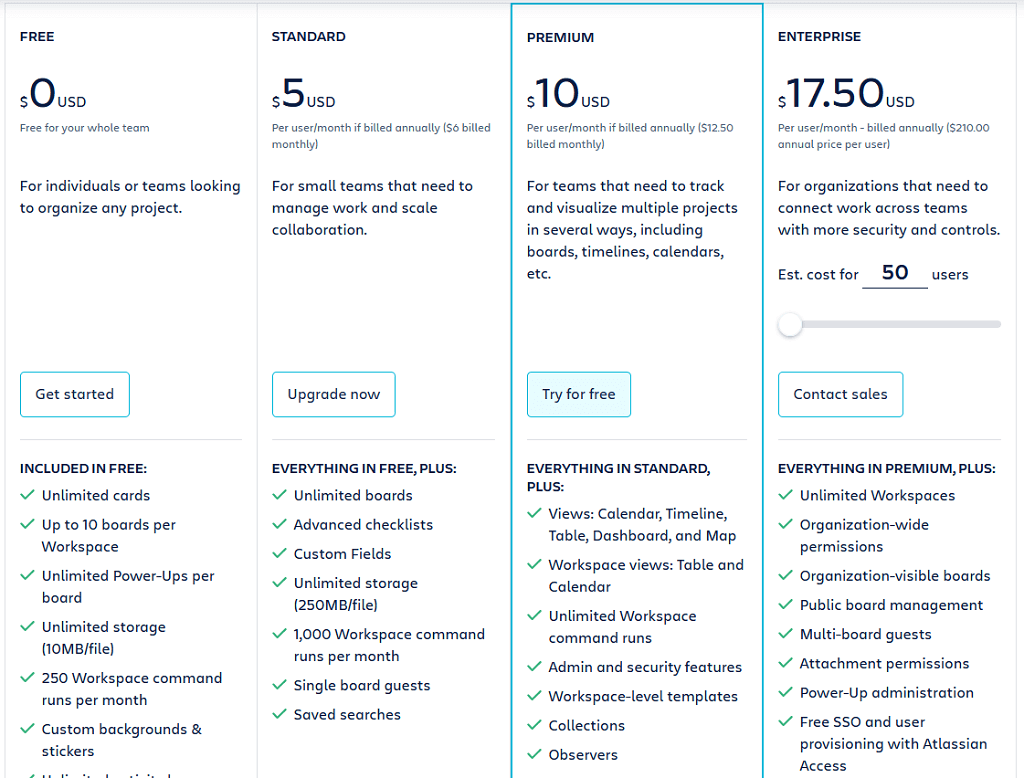 - 標準:1か月あたり5ドル(毎年請求されます)。小さなチーム向けの無制限のボードとより高度な機能。