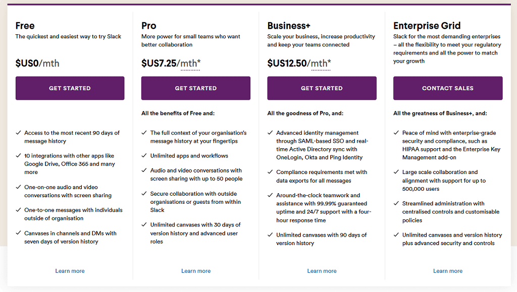 - プロ:ユーザーあたり月額7.25ドル。完全なメッセージ履歴、無制限のアプリ、最大50人のビデオ会話、および高度なセキュリティ機能を追加します。