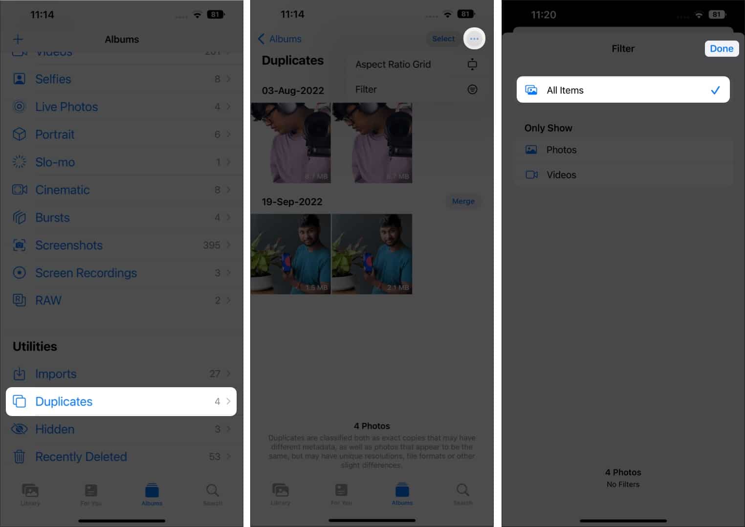 Duplicatesアルバムには、複製の写真やビデオを表示したい場合にフィルタリングして選択できるオプションがあります。デフォルトのオプションは両方に設定されています。ただし、アルバム内のフィルターがグリッチされているため、写真が隠されている可能性がわずかにあります。その場合、写真とビデオの両方を表示するフィルターを変更して選択する方法を次に示します。