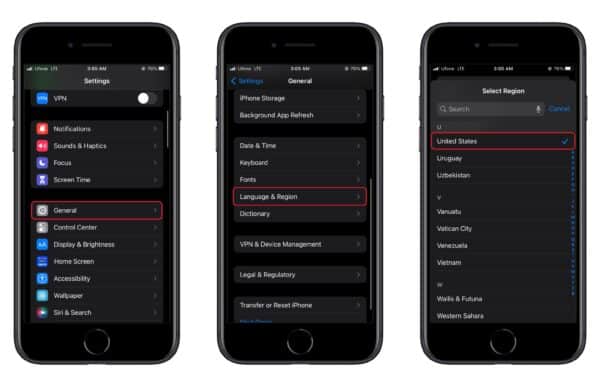 - 最後に、タップします地域選択しますユナイテッド 状態。