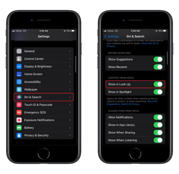 視覚的な検索は、適切に機能するためにSiriに依存しています。デバイスの使用に基づいて関連情報を提案する上でその有効性を確保するには、デバイス学習を有効にすることが重要です。 Siriがこの機能を使用することを許可しない場合、コンテンツは表示されません。これを有効にする方法は次のとおりです。