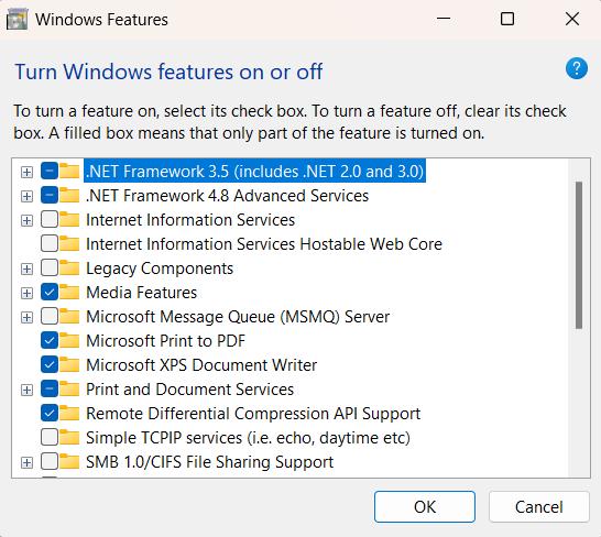 ステップ4:「Windows機能」ウィンドウ、探してください」.NETフレームワーク」利用可能な機能のリスト。