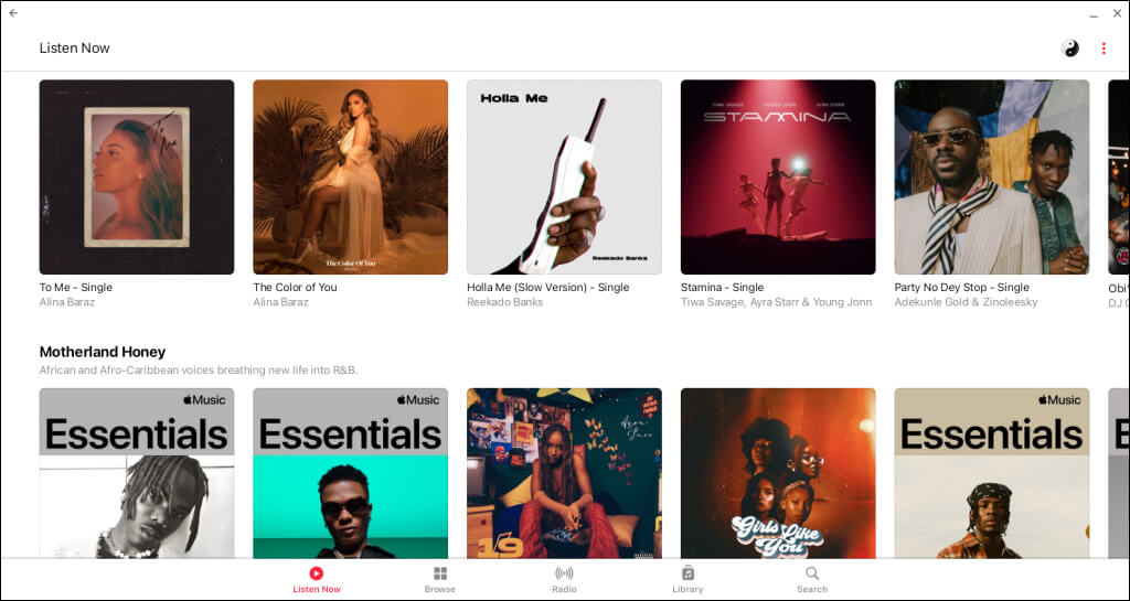 アプリのインターフェイス、機能、および機能は、Apple Music iOSアプリバージョンに似ています。曲を再生したり、プレイリストにアルバムを追加したり、アプリでApple Musicプロファイルを作成または管理することもできます。