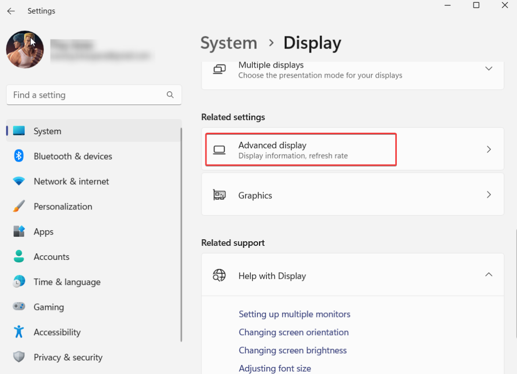 4。下にスクロールします関連設定、クリックしてください高度なディスプレイ
