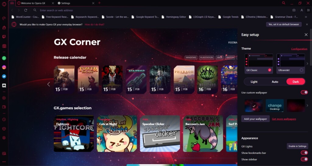 Opera GXの最も強調表示される機能の1つは、広告を自動的にブロックします およびトラッカーサイトやソーシャルメディアプラットフォームで、シームレスなブラウジングエクスペリエンスを提供します。最後になりましたが、それも提供していますカスタマイズオプションのトンユーザーの外観をより風変わりにし、雰囲気に合わせます。