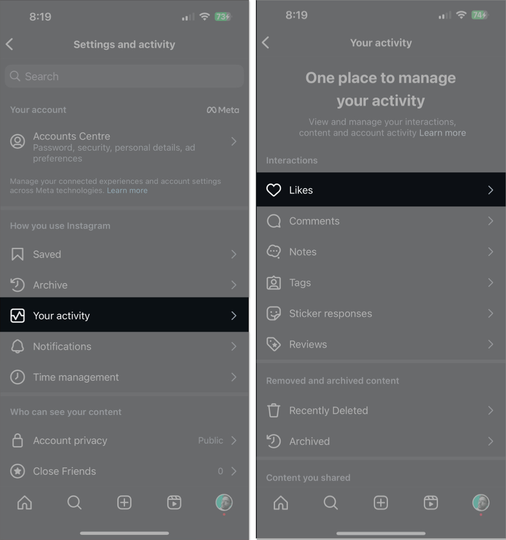 iPhoneのInstagramプロフィールに移動して、スリーラインメニュー(☰)右上隅に。あなたを選択します活動タップしますいいね。これで、好きな投稿、リール、ビデオのグリッドが表示されます。ここからは、投稿とは違っています。