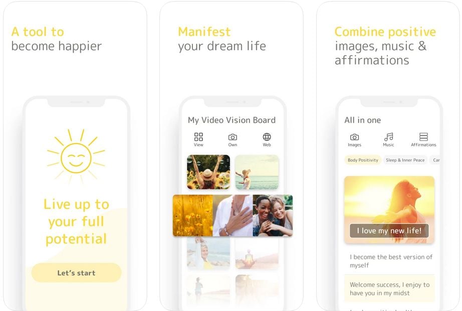 このアプリは、頻繁に参照できるビジョンボードと目標設定システムを作成する素晴らしい方法です。必要に応じて、必要に応じてフィルターを追加し、写真のキャプションとして肯定を書くことができます。目のアイコンをタップして、ビジョンボードのスライドショープレイをすることができます。また、携帯電話からの音楽など、演奏されている音楽を変更するために設定に移動することもできます。