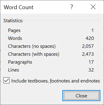 単語カウントボックスには、スペースを含む、および除外されたドキュメントの文字カウントが表示されます。