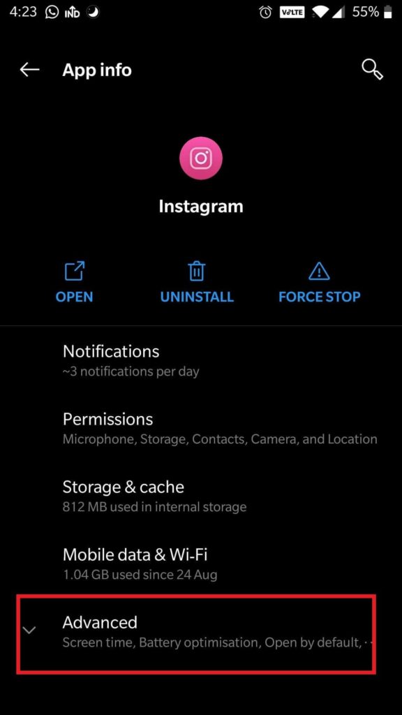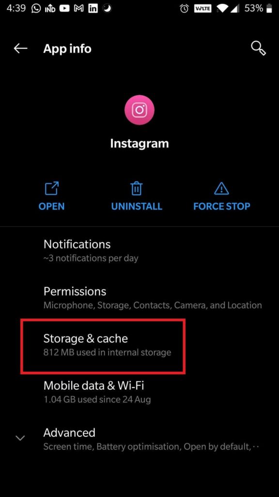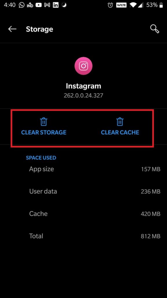 - 今すぐクリックしてくださいクリアストレージとクリアキャッシュオプションを使用して、Instagramのストレージデータとキャッシュデータを削除する手順に従ってください。