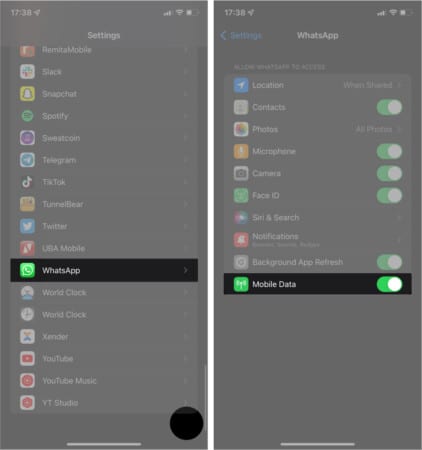 iPhoneを開きます設定→whatsapp→オンに切り替えますモバイルデータそれが決してアクティブではなかった場合。