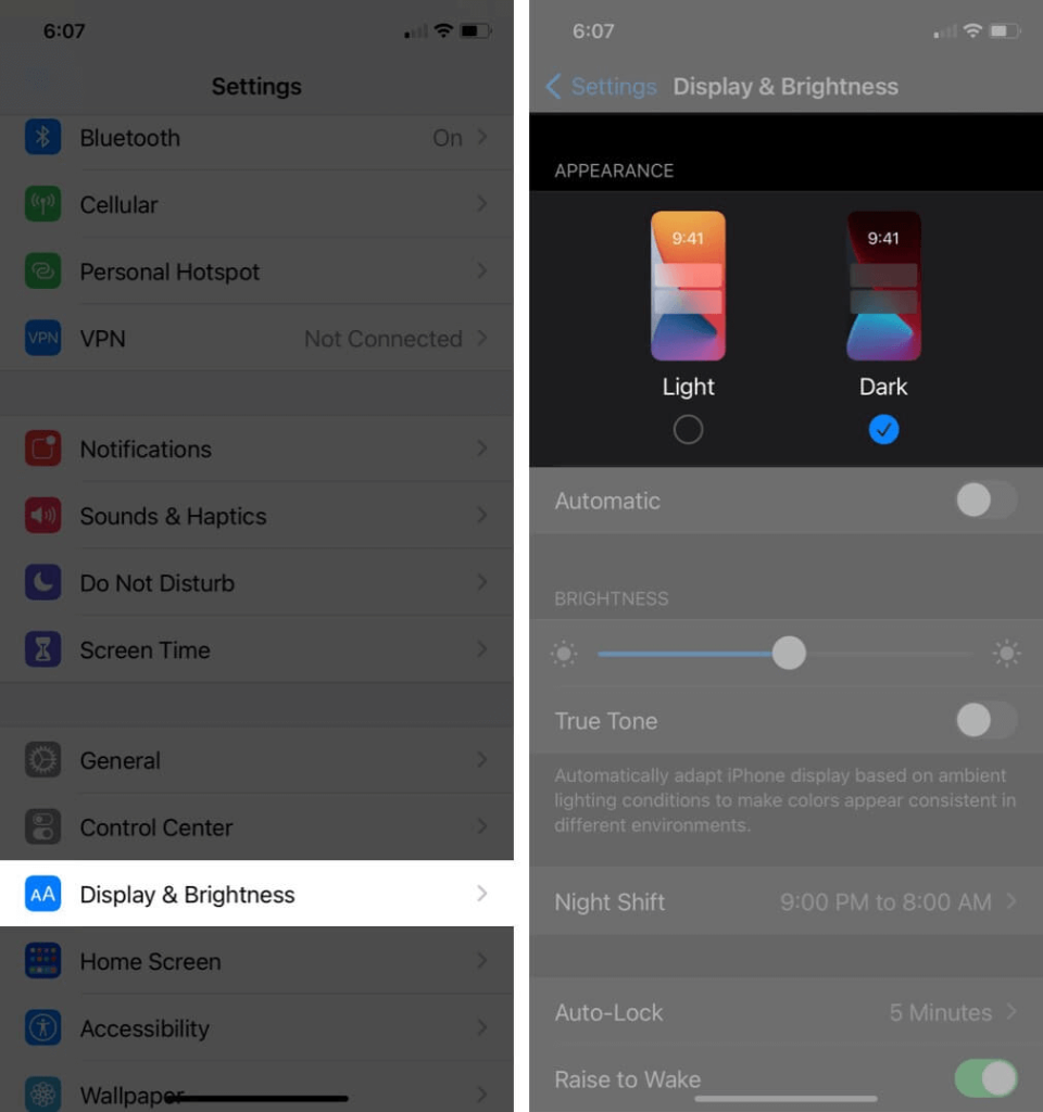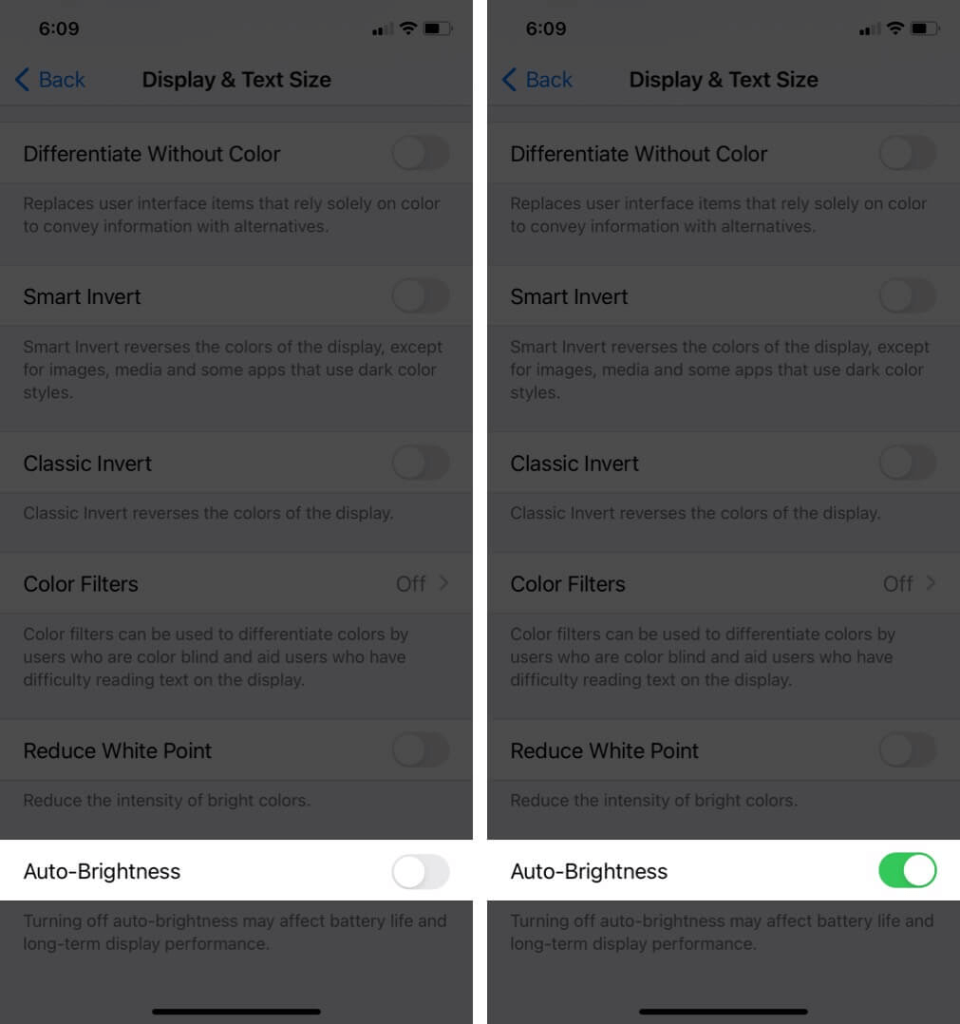 必要に応じて明るさを自動的に縮小することにより、自動明度はバッテリー寿命を節約します。このオプションはデフォルトでオンになります。ただし、変更したことがある場合は、再度確認して、この機能を有効にしてiOS 17のバッテリーの問題を修正する方法を次に示します。