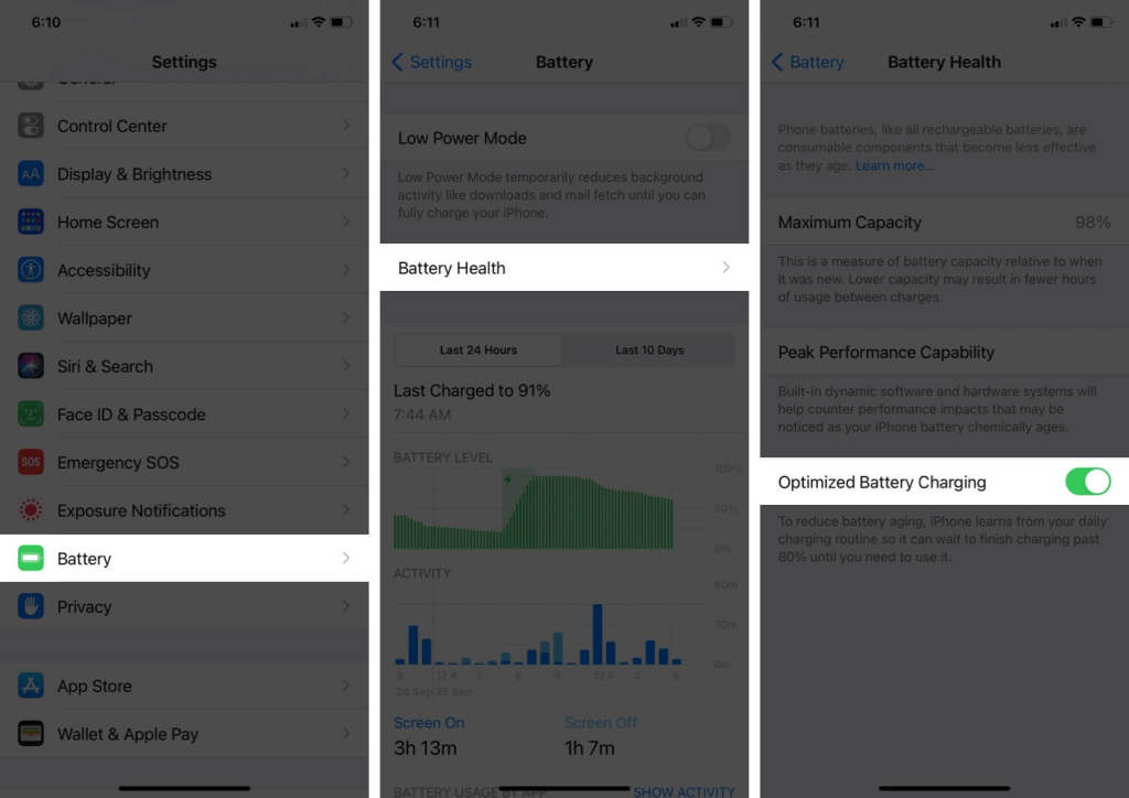 ステップ1:バッテリーに移動してから、設定アプリでバッテリーの健康状態に移動します。