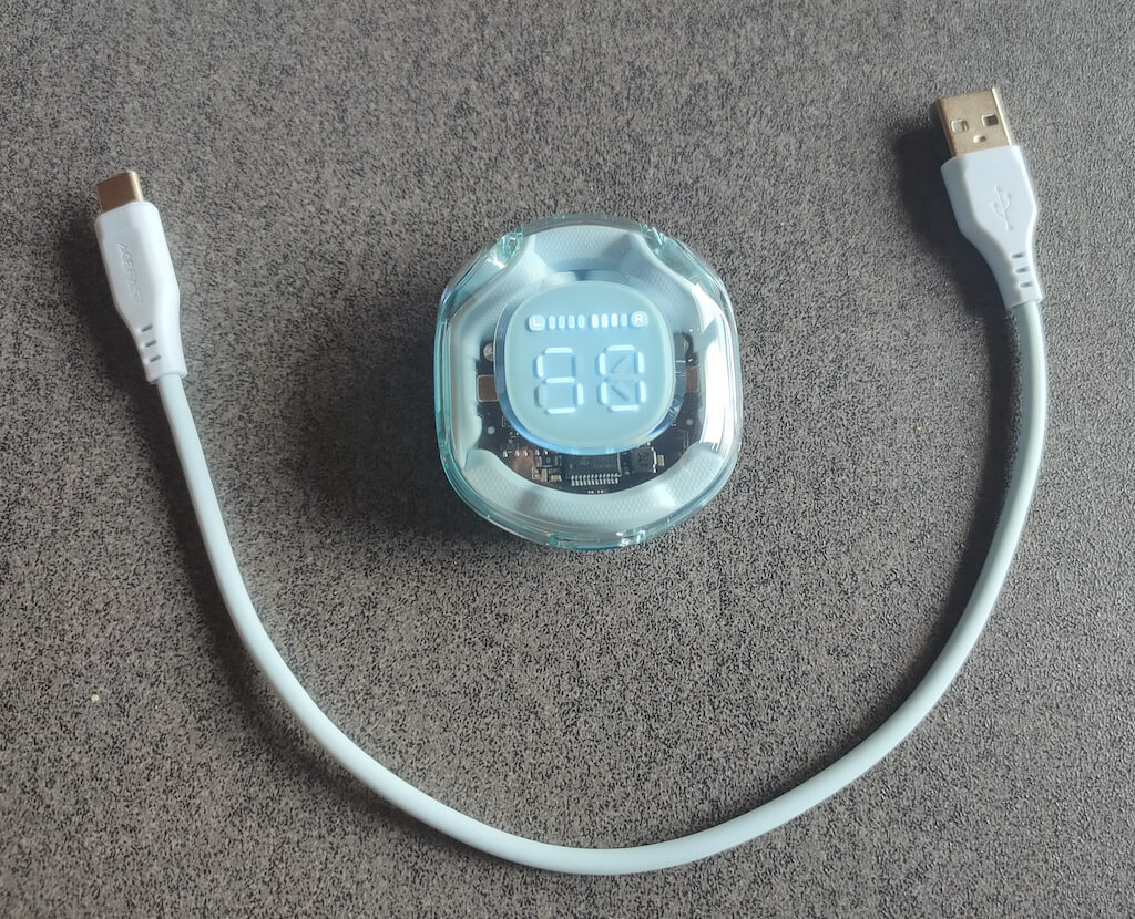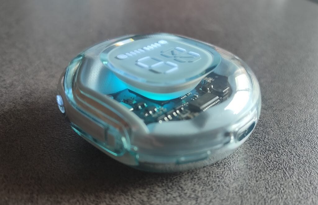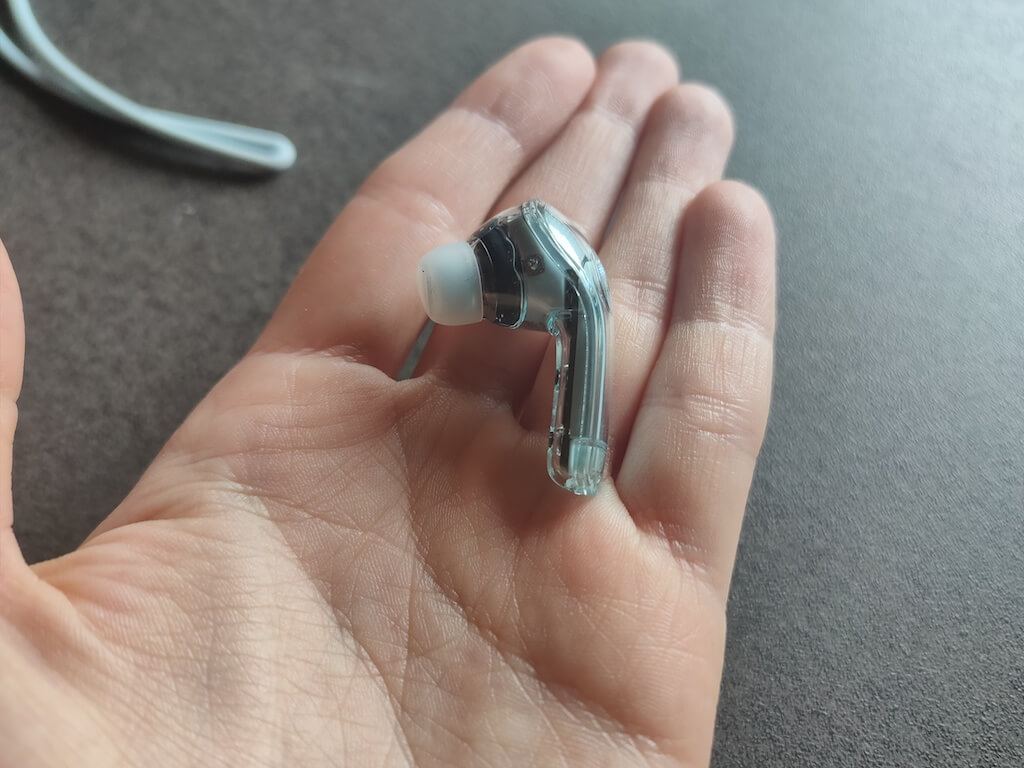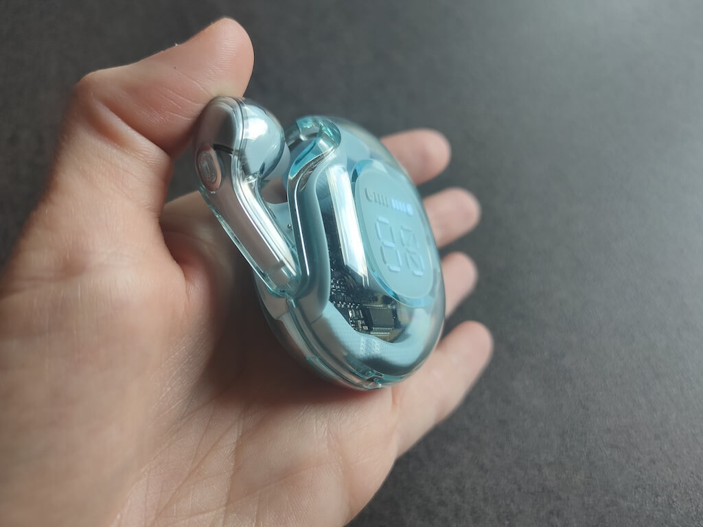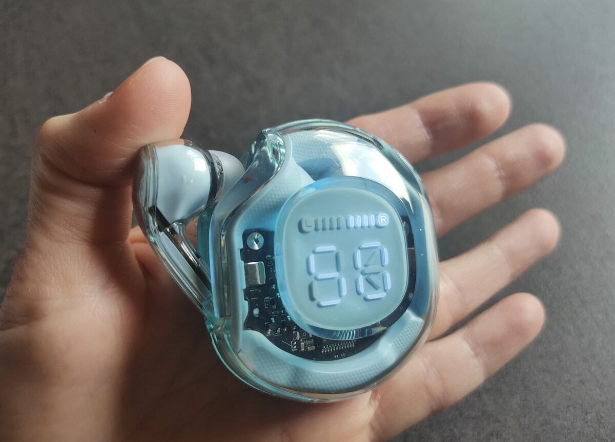 イヤホンには、充電ケースと芽の内側を露出させる透明なビットで、黒、白、青、緑、ピンク、紫の6つの異なる色のバリエーションがあります。テスト用のアイスブルーバージョンがありました。