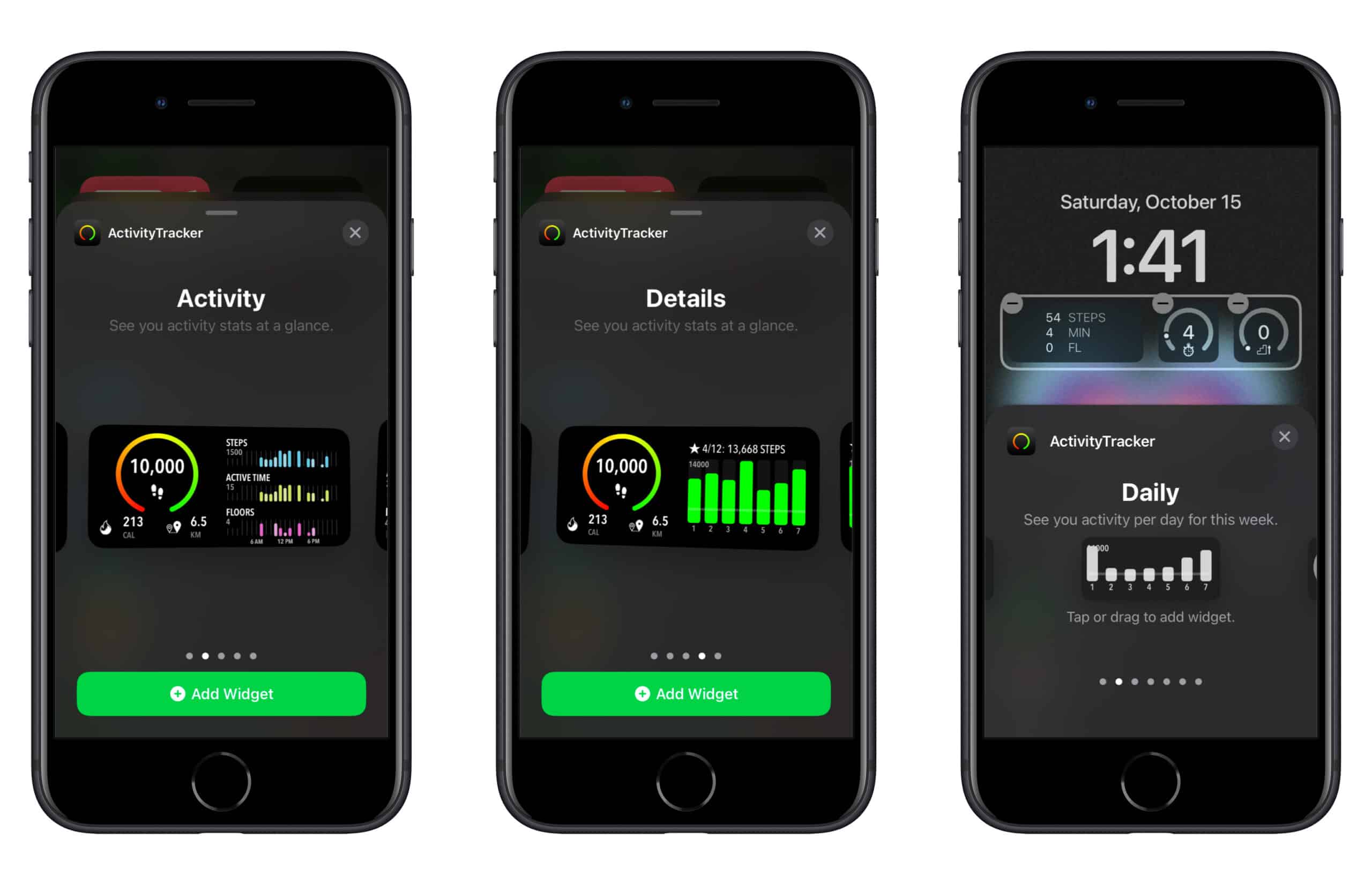 AcitVityTrackには、フィットネスの統計を要約して5つのホーム画面ウィジェットを提供します。これらには、アクティビティ用の2つのウィジェット、詳細用の2つのウィジェット、過去7日間のアクティビティ用の1つのウィジェットが含まれます。
