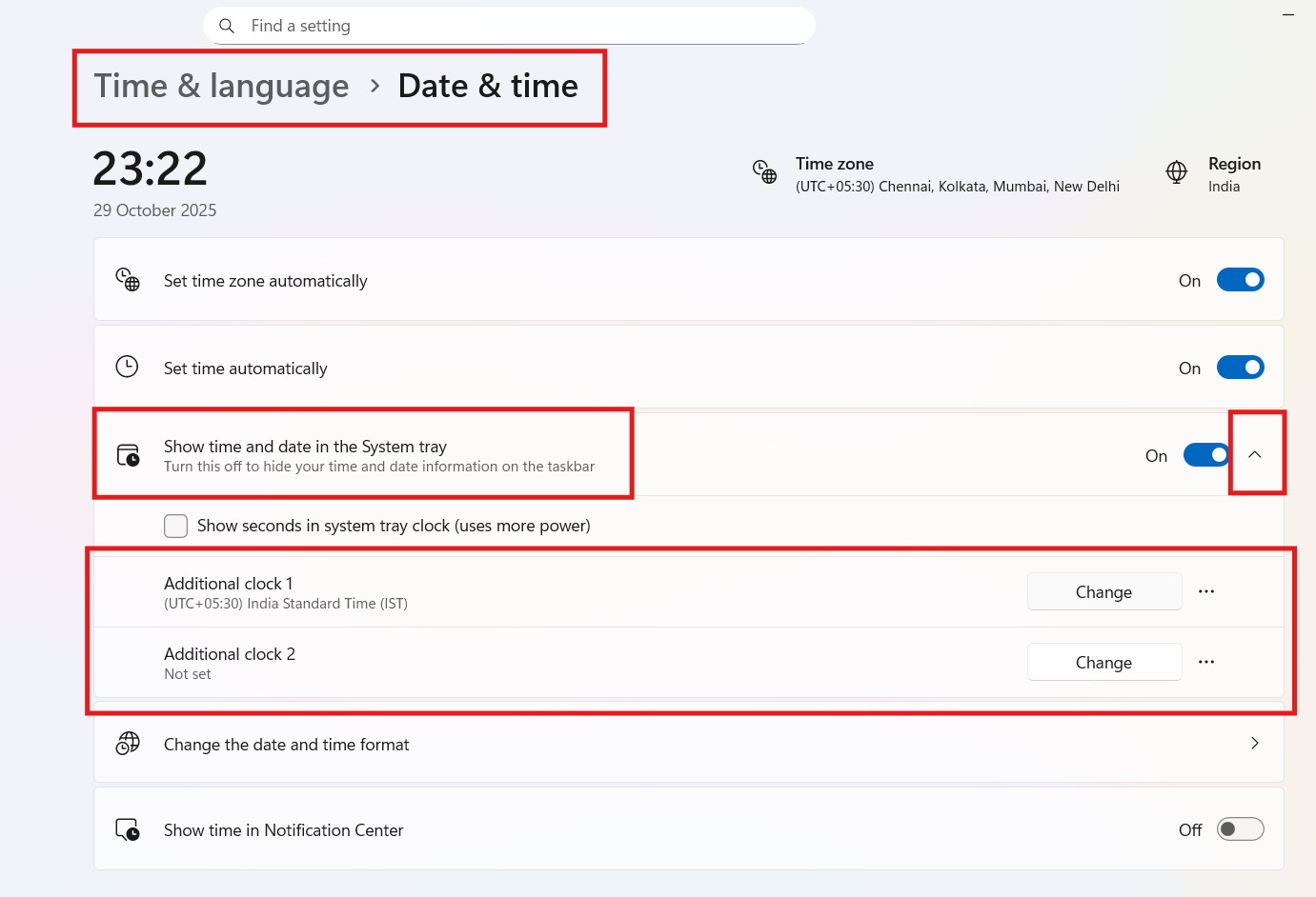 1. [設定] を開き、[時刻と言語]、[日付と時刻] の順に移動します。