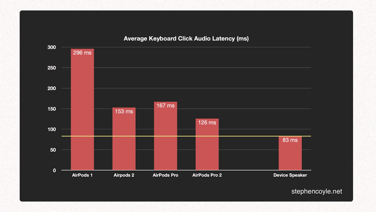 おそらく、より興味深い点は、第2世代のAirPods Proが組み込みのスピーカー(83ms)よりも43msしかないことです。これは、Bluetoothデータがデバイスを離れる前に、画面に触れてからノイズを聞くまでの時間の最大3分の2が発生することを示唆しています。オーディオフィードバックがAirPods Pro 2にぴったりと応答性が高いと感じるには、まだ遅すぎると思いますが、この時点で、デバイス側のレイテンシを減らすために作業することで簡単に獲得できると思います。