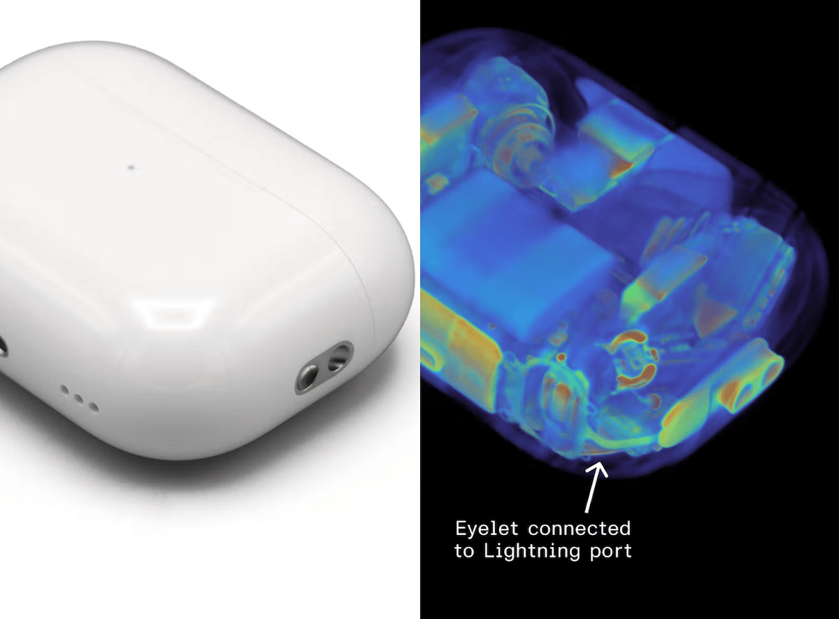 Lumafieldは、第2世代の充電ケースの内部レイアウトを明らかにしたAirpod Pro 2の「非破壊的な」分解にNeptune Industrial CTスキャナーを使用しました。第一世代のケースとは異なり、新しいケースは、誘導充電コイルの周りに4つの磁石を追加して、マグサフまたはアップルウォッチの充電器に合わせます。