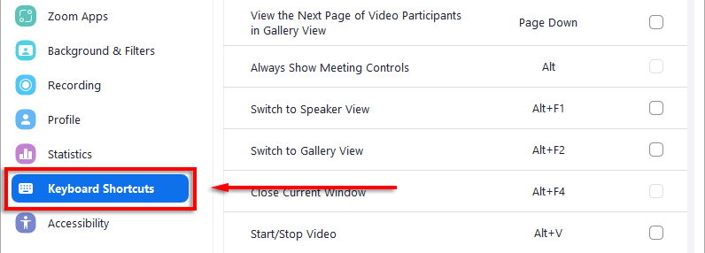 ショートカットがWindowsで動作するには、Zoom Desktop Clientバージョン5.2.0以降を使用する必要があります。さらに、すべてのキーボードショートカットを表示およびカスタマイズできます。ショートカットを変更するには: