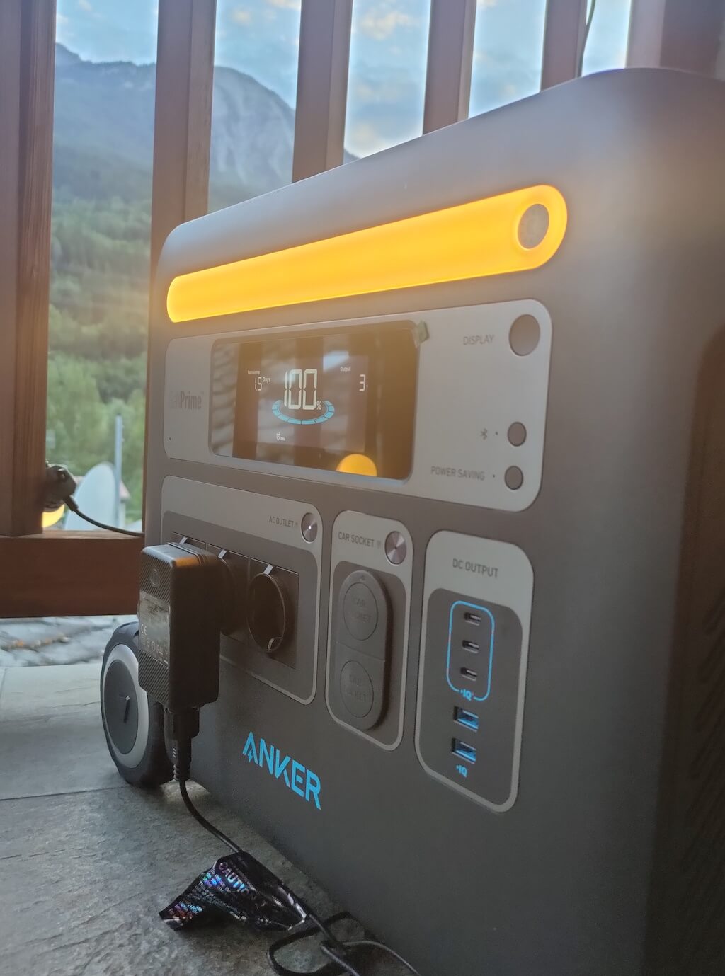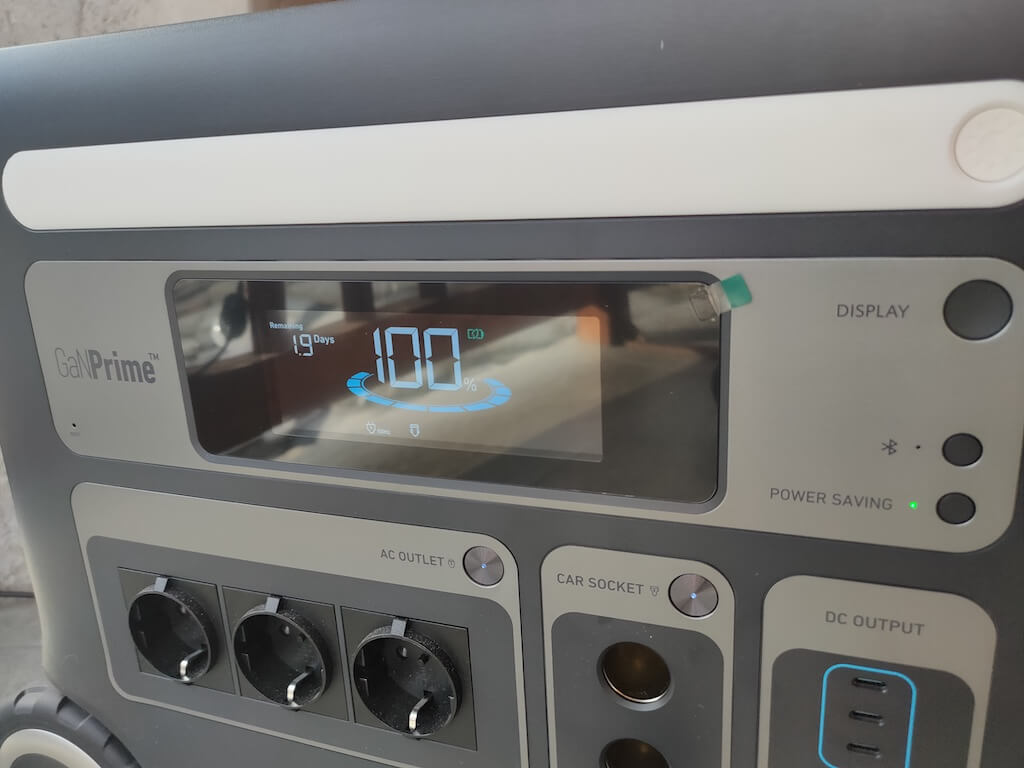 アウトレットの上には、残りの充電レベルをパーセンテージとして表示する大きなLCDスクリーンと、残りのバッテリー容量を表すために徐々に消えてしまう電源バーの半円形があります。