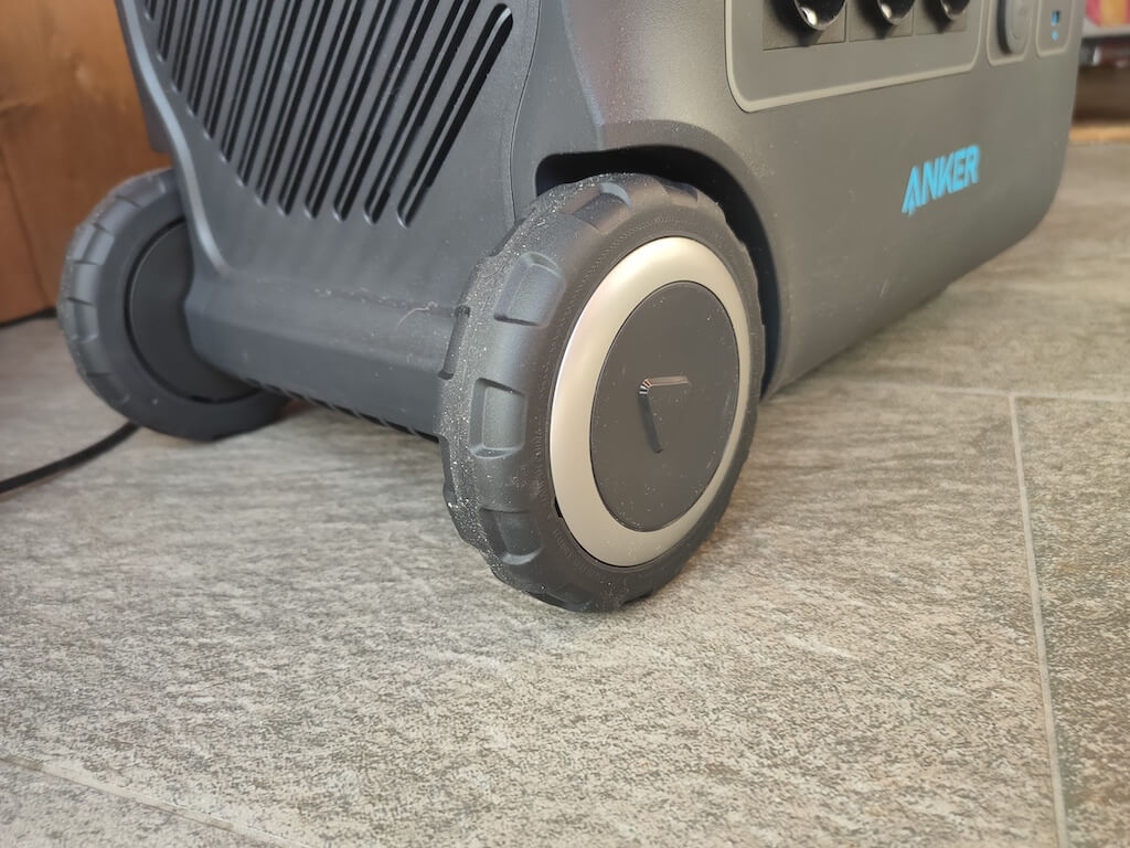 これは携帯用発電所ですが、私が見た中で最大の発電所の1つです。体重は67ポンドですが、間違いなく重いですが、Ankerには思慮深い機能が統合され、移動が容易になりました。スーツケースのように、Powerhouse 767には側面から伸びる伸縮ハンドルが装備されているため、4.72インチのホイールのペアで転がすことができます。