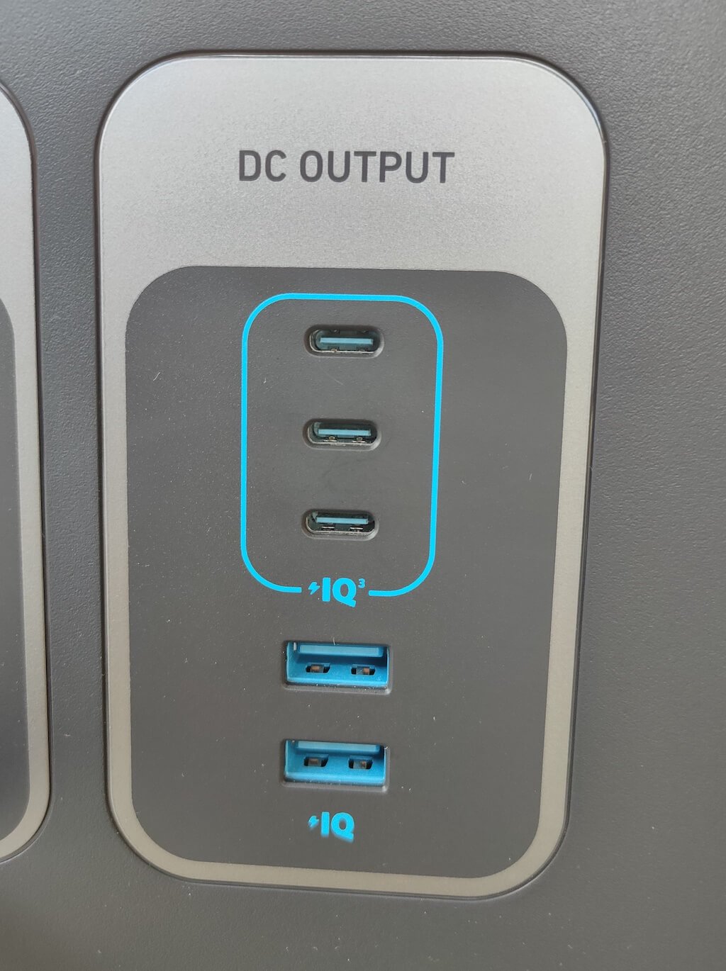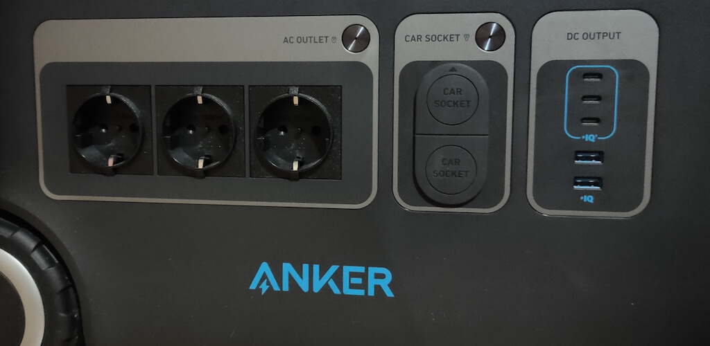 フロントパネルには、さまざまなアウトレットとポートがあり、デバイスにさまざまな充電オプションを提供します。 3つのACアウトレット(米国版)があります。レクリエーション車両(RV)に接続するために特別に設計されたTT-30Rアウトレットを備えた4つのACアウトレット、12V車のソケットアウトレット、3つのUSB-Cポート、2つのUSB-Aポートがあります。