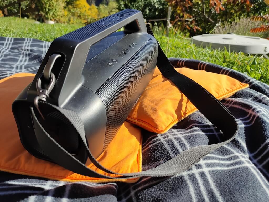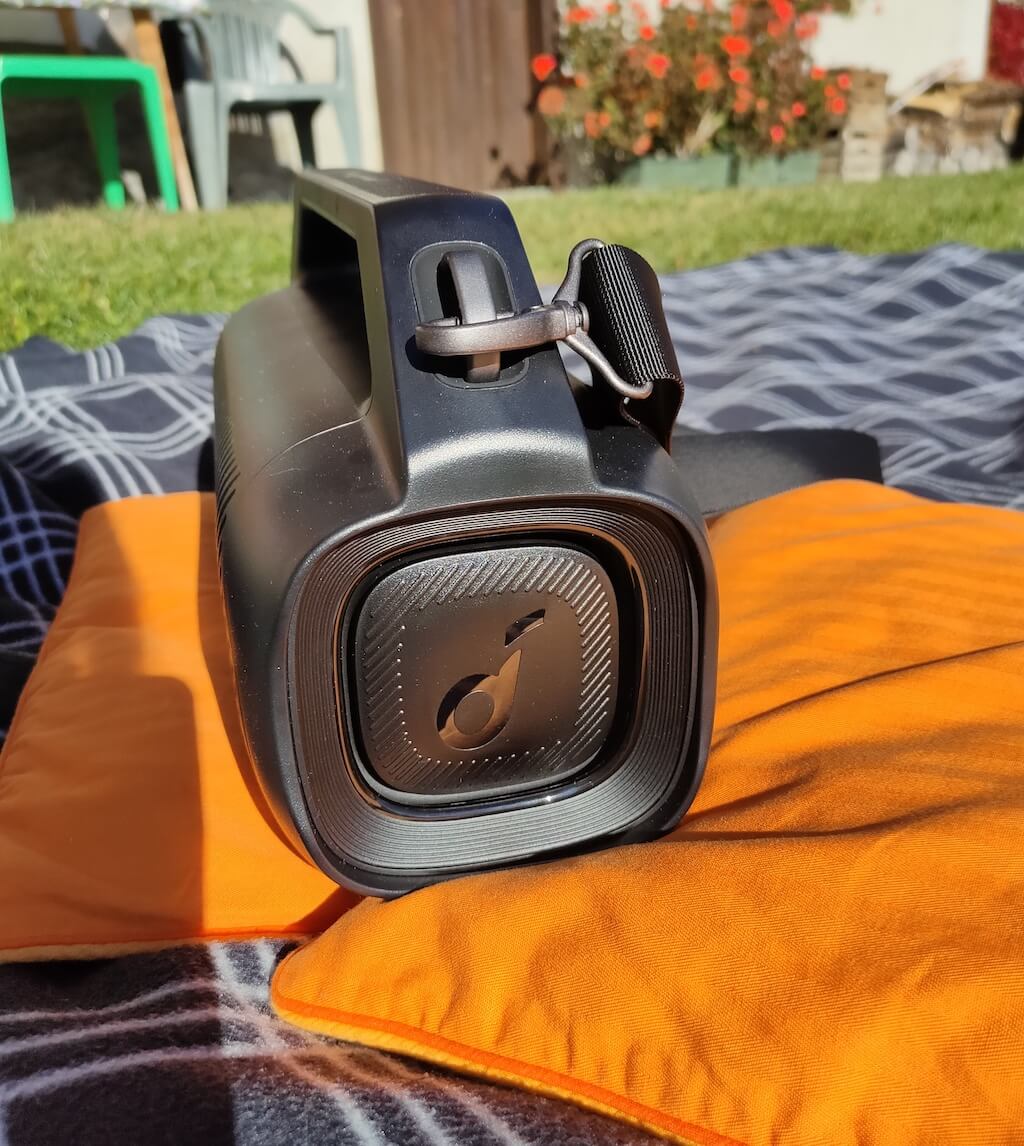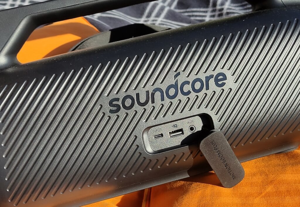 外観に関しては、Motion Boom Plusは前身であるMotion Boomに似ています。新しいモデルには、フロントグリルに同じ形状とサウンドコアのロゴがあります。ただし、Motion Boom Plusははるかに大きく、ハンドルが組み込まれており、キャリングストラップが付属しています。それとスピーカーは完全に水とほこりのないものであるため、屋外アクティビティに最適です。