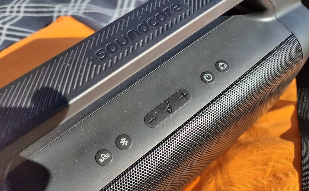 スピーカーの上に、ハンドルの下にコントロールボタンがあります。 SoundCoreのバスアップテクノロジー、Bluetoothボタン、電源スイッチ、PartyCastを有効にするためのボタンをアクティブにするボタンがあります。ボタンが使用されているときに照らされます。パネルの中央には、ボリュームコントロールと再生/一時停止ボタンを備えたゴム製ストリップがあります。