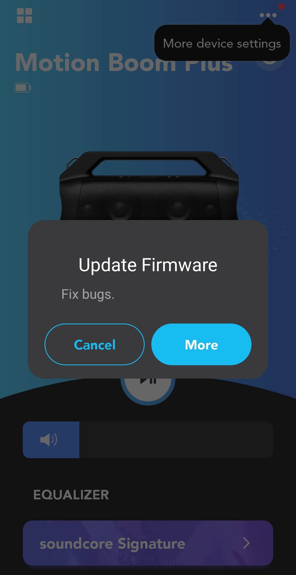 このアプリの主な機能は、アップデートとファームウェアを配信することです。 SoundCoreは、ユーザーに、ピークパフォーマンスを確保するために最新のファームウェアにデバイスを更新するようにアドバイスします。ファームウェアの更新とは別に、SoundCoreアプリを使用すると、アプリ内からボリュームと追加の低音機能を制御し、自動電源オフ機能をセットアップできます。