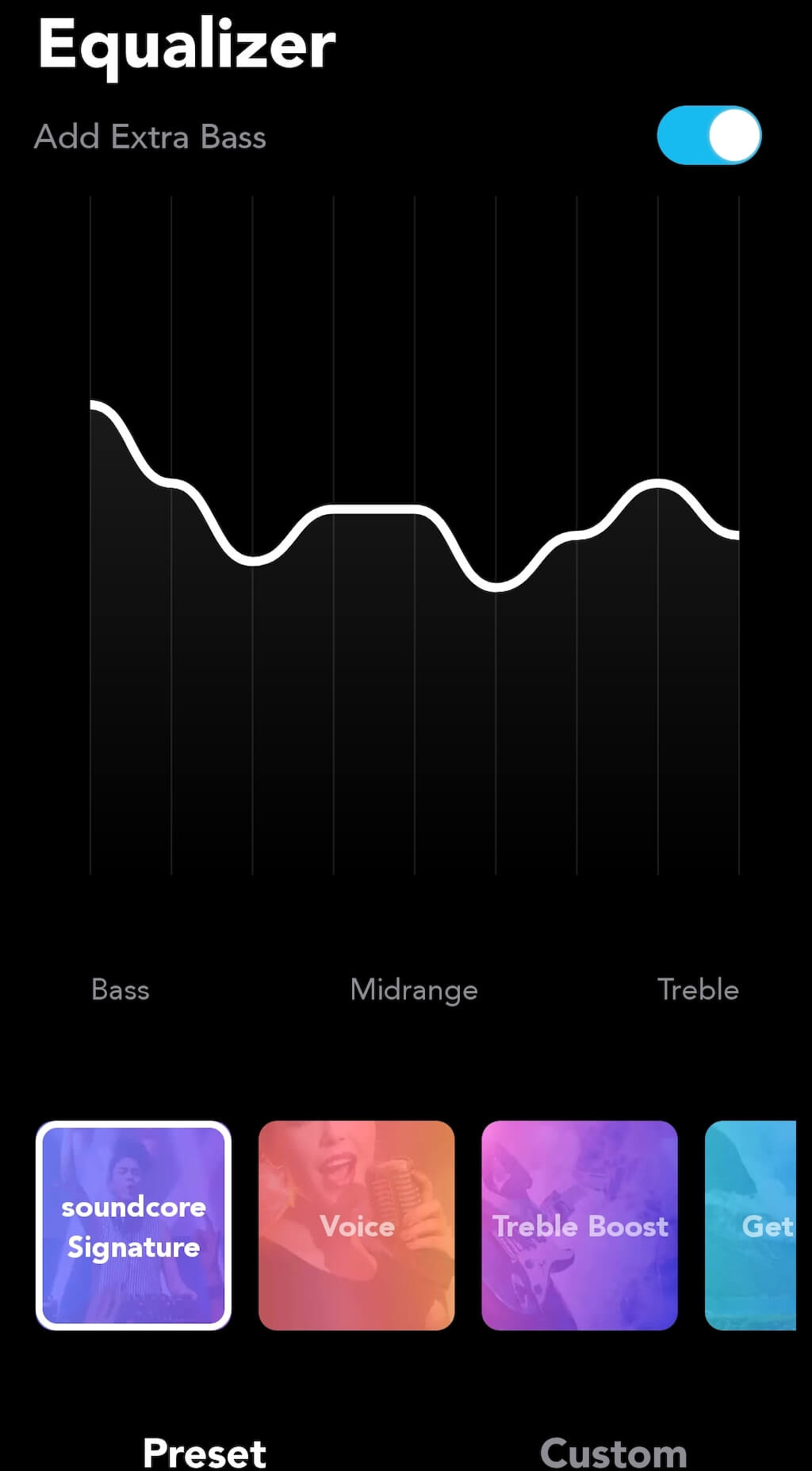 Soundcoreアプリの最も興味深い部分は、イコライザーです。正確な仕様に合わせてスピーカーの音を微調整する場合は、SoundCoreアカウントを作成し、さまざまな機会にカスタムEQプロファイルを設定できます。スペックをいじりたくない場合は、アプリで利用可能なプリセットのいずれかを使用できます。SoundCoreSignatureを試してみることをお勧めします。
