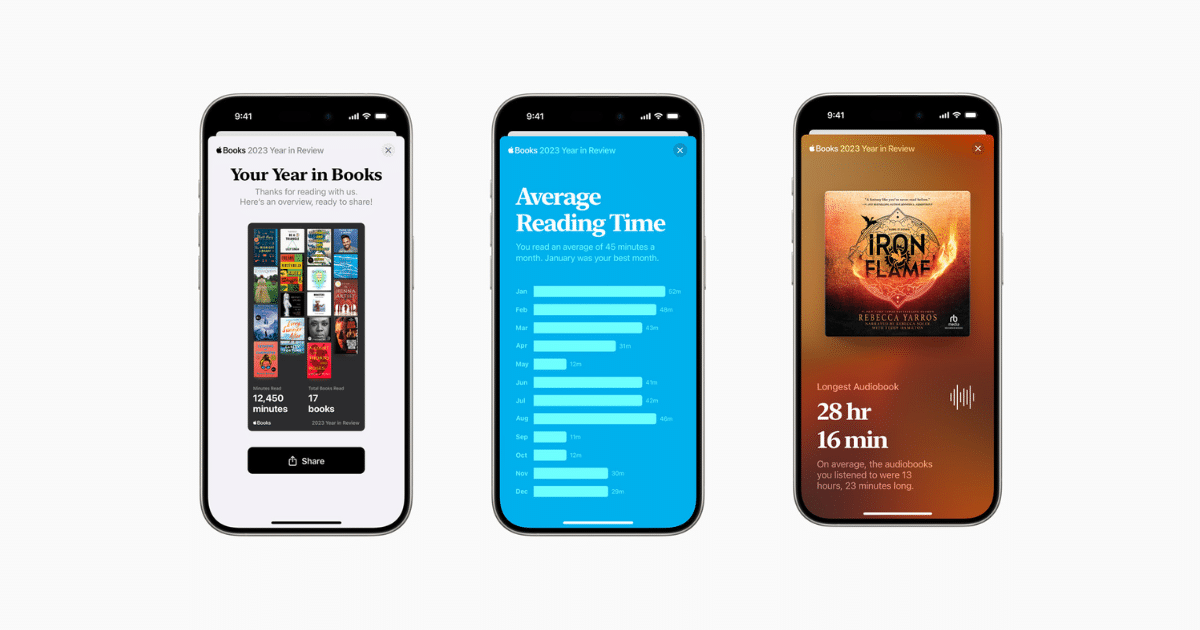 Apple Booksユーザーは、トップピックの下の[今すぐ読み取り]タブ内で、レビューエクスペリエンスでパーソナライズされた年にアクセスできるようになりました。この機能は、2023年のリーディングジャーニーの包括的な概要を提供します。これには、読書の合計時間、消費された最長の本やオーディオブック、最も読み物の著者とジャンル、最高評価の本が含まれます。さらに、ユーザーはレビューの年に本やオーディオブックを手動で追加することができ、文学的な好みを完全に反映することができます。