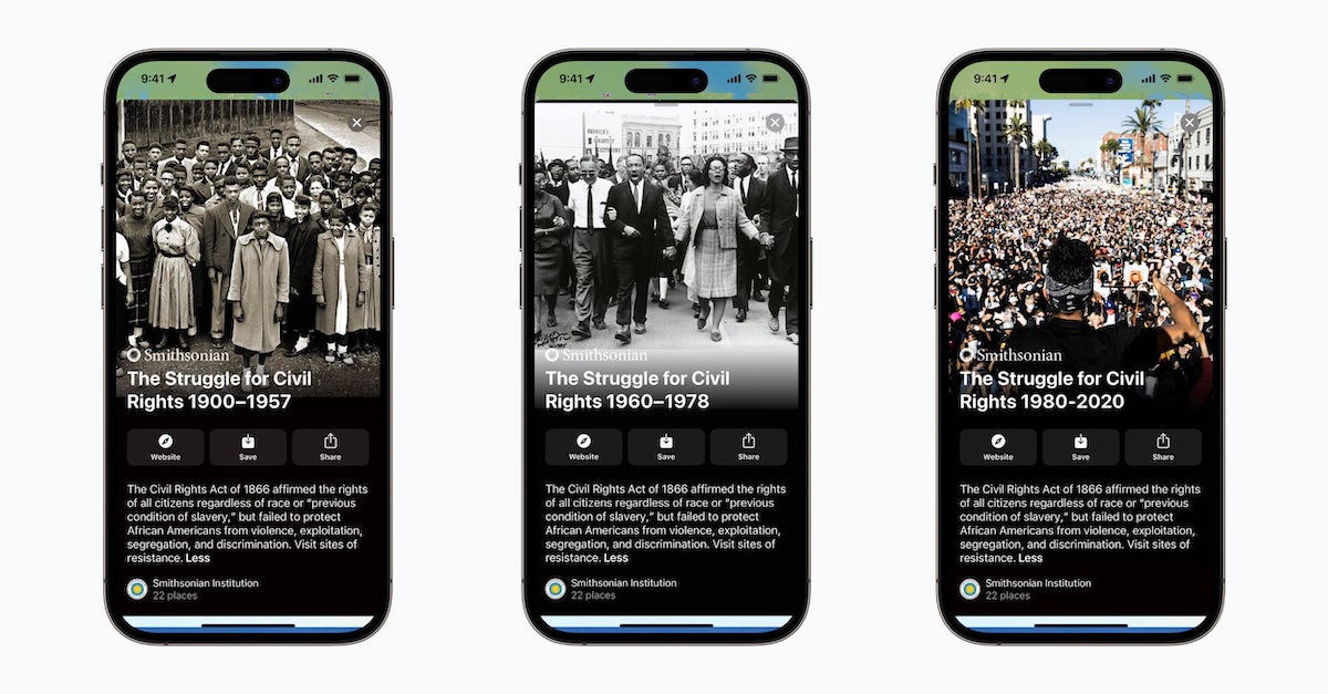 - Smithsonianによって作成されたマップ機能一連のガイド過去1世紀(1900-1957、1960-1978、1980-2020)にわたる公民権の闘争に関連する重要なランドマークを強調して、ユーザーが国の歴史を形作った人々、場所、出来事について学ぶことができます。