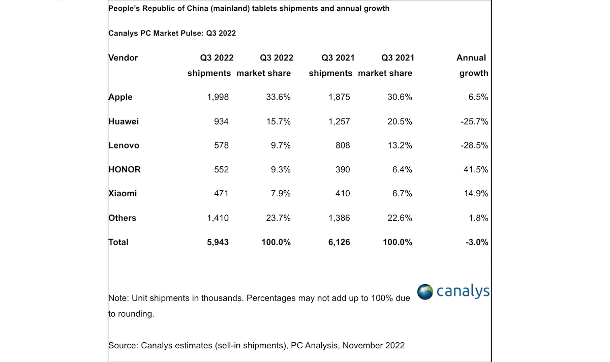 Canalysの中国のPC(デスクトップ、ノート、ワークステーション)の出荷に関する最新の調査によると、Apple iPadは2022年第3四半期に中国のタブレット市場を支配していました。 2022年第4四半期に、Appleは901億ドルの記録的な収益を報告し、iPadの販売は7.2ドルを占めました。 2021年第4四半期の83億ドルからわずかに減少した10億。