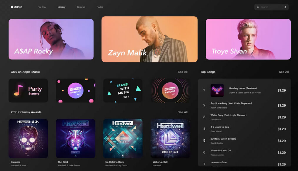 Apple Musicには、画面の上部(またはモバイルアプリの下部)に沿って実行されるさまざまなタブを備えた灰色のインターフェイスがあります。ここからライブラリ、ブラウザ、ラジオのためにライブラリに簡単に移動できます。それは簡単でミニマルなので、非常にユーザーフレンドリーです。