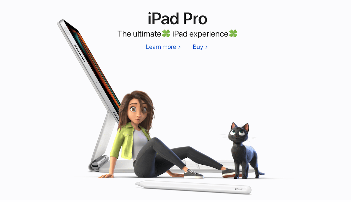 Appleは、サムとボブがiPad Proの隣に登場するホームページのフルページの買収、iPhone 13、MacBookの不機嫌そうなウサギのボス、セクションで実行されている映画のクリップで「運」を宣伝しています。