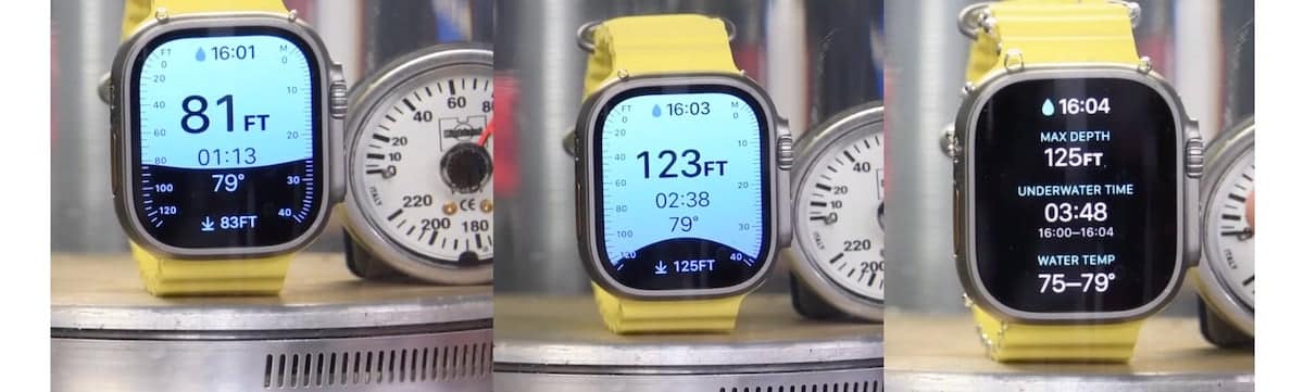 Apple Watch Ultraは、水中アクティビティ用の水温センサーを備えた深度ゲージのみを備えています。新しい深度アプリと統合されたApple Watch Ultraは、最大の深さ(最大130フィートまたは40メートル)、水温、および水中の期間を測定できます。