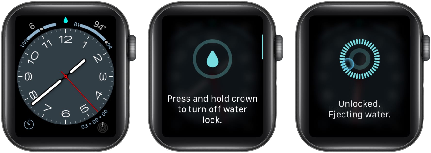 これを確認するには、ウォッチフェイスの上部にある青い水滴のアイコンを探してください。水滴のアイコンが表示され、Apple WatchがWatchosを9以降に実行している場合は、Pressデジタルクラウンウォーターロック機能を無効にします。ただし、Apple WatchがWatchOSを8以前に実行している場合、デジタルクラウンウォーターロックを無効にする。