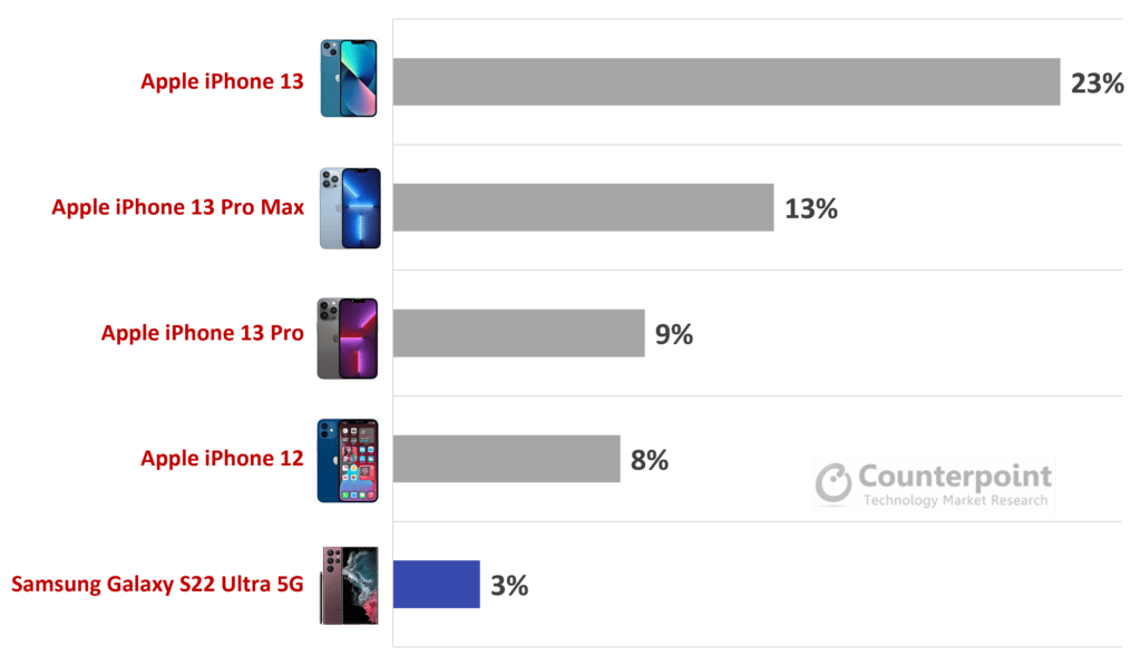 Cupertino Techの巨人は、四半期中にプレミアムマーカーをリードし続け、2回連続で60%の市場シェアを超えました。 CounterPointによると、これはiPhone 13モデルの販売によって促進されたと述べています。ラインナップの標準モデルは、昨年10月以来、毎月グローバルにベストセラーのスマートフォンでした。これはまた、2017年第1四半期以来、プレミアムセグメントのハイテク大手の第1四半期の最高のシェアでした。