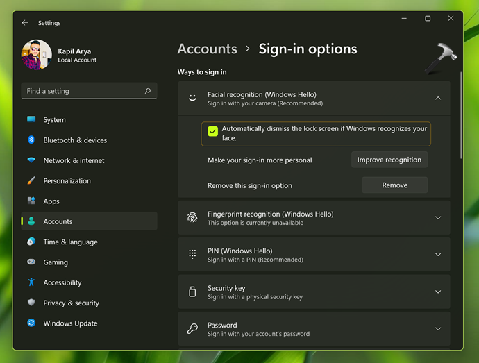 3。サインインする方法の下で、顔認識(Windows Hello)を拡張して確認してくださいWindows Helloがあなたの顔を認識した場合、ロック画面を自動的に却下しますオプション。