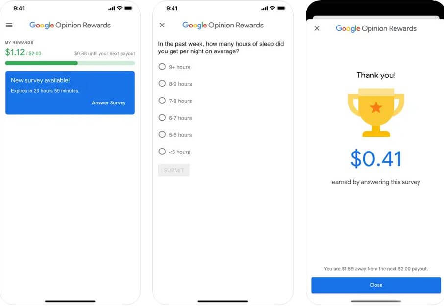 Googleの意見の報酬は、期間にわたって少量の現金を作る簡単な方法です。調査に参加する調査を提供し、調査ごとに約10〜20セントに報います。このアプリの素晴らしいところは、調査の資格がなくても、補償を受け取ることです。
