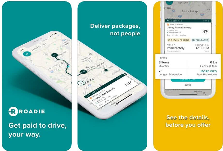 Roadie Driverは、店から拾い上げて指定された場所にパッケージを落とすことで、店から商品を配達できるアプリです。配達ごとに支払われるので、稼ぐ金額は配達を終了できる速さによって異なります。