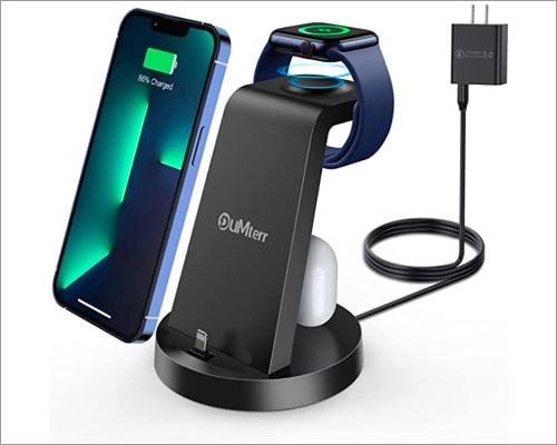 Dumterr 3-in-1充電器は、Apple製品に最適な充電ステーションの1つです。そのUSPは、ガジェットのケースでも充電をサポートするという事実にあります。さらに、プラグインドックは、さまざまな形や厚さの電話ケースとシームレスな互換性を提供します。このワイヤレス充電器を使用すると、iPhone、AirPods、Apple Watchを同時に電源で供給できます。