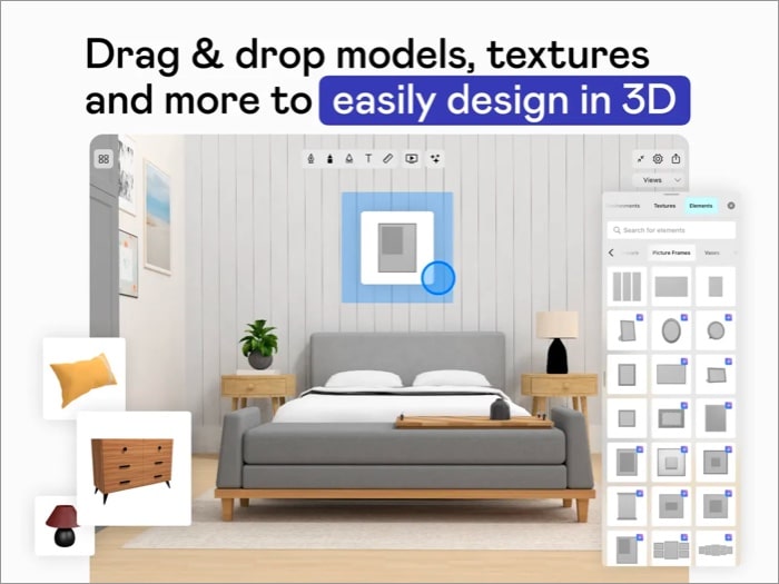 また、すぐに使用できるコンポーネントや、木材、金属、ガラスなどのいくつかの材料にアクセスして、3Dで家具を組み立てることができます。さらに、このアプリを使用すると、拡張現実統合のおかげで、電話カメラを使用してスペースの構造を視覚化できます。