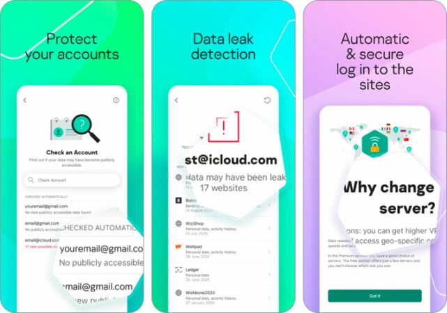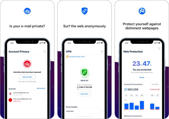 他の多くのウイルス対策アプリと同様に、このアプリはオンラインプレゼンスをマスクするVPNサービスを備えています。また、セキュリティ侵害に関与するためにメールIDをスキャンするアカウントプライバシープログラムもあります。したがって、これはあなたのデータが漏れた場所を教えてくれ、それを保護する方法を推奨します。