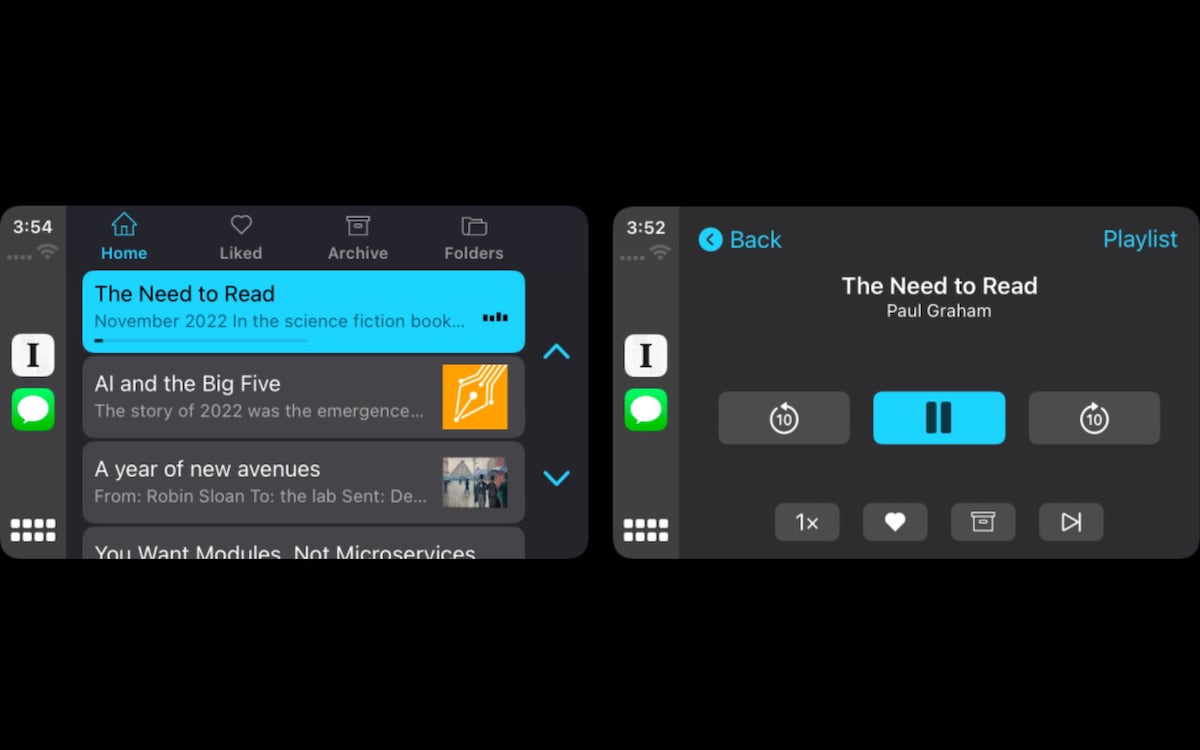 2023年5月4日:人気のある読み取りアプリであるInstapaperがCarPlayで利用可能になりました。アプリのCarPlayバージョンは、テキストツースピック技術を使用してさまざまな声で記事を読み、ユーザーがInstapaperライブラリ全体を聞いている間、アーカイブ、ホーム、フォルダーの記事を運転しています。