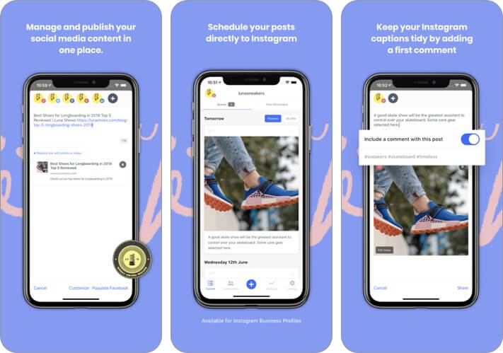 ソーシャルメディアプラットフォームごとに画像を簡単にカスタマイズできるようにする洗練されたツールです。 Instagramフィードをプレビューして、ハッシュタグで最初のコメントをスケジュールすることもできます。さらに、他の人とコラボレーションすることができます。これは、ブログをスケールアップするときに役立ちます。機能のほとんどは、有料のサブスクリプションを取得する必要がありますが、ソーシャルメディアコンテンツを整理したい場合は価値があります。