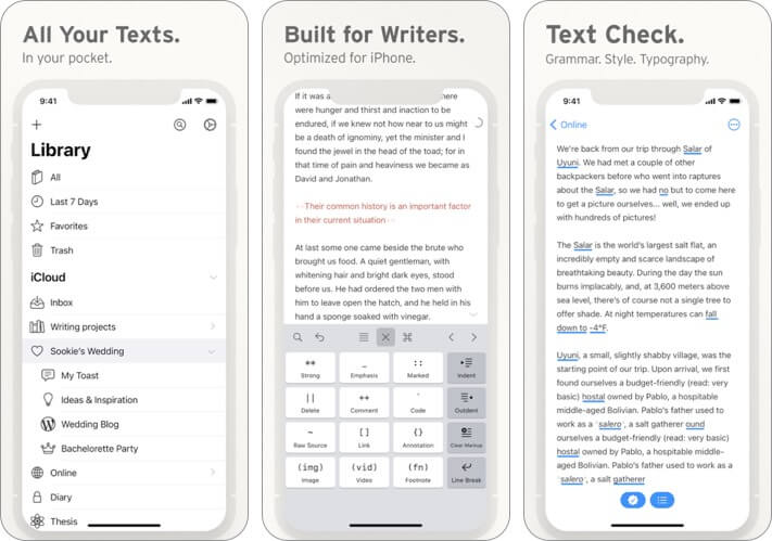 クリーンインターフェイスは、焦点を合わせるのに役立ちます。シームレスな同期や柔軟なエクスポートなどの機能は、ライティングプロセスを合理化するのに役立ちます。さらに、20を超える言語の統合された文法とスタイルチェックがあり、コンテンツが最適であることを確認します。オールインワンのライティング機能により、このブログアプリは、多くを書く人にとっては価格に見合う価値があります。