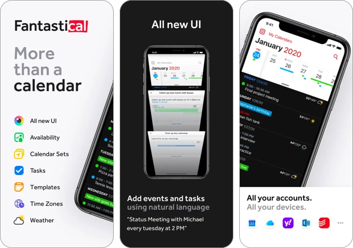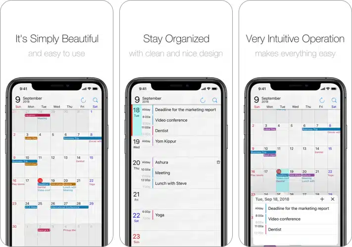 これには、さまざまな便利でモダンな機能が搭載されています。アプリについて最初に気に入ったのは、Google、Outlook、Ial、Yahoo、およびiCloudと簡単に同期することです。また、リスト、日、週、アジェンダ、年、月などのオプションからビューを切り替えることができます。このアプリは、Airdrop&Airprintと互換性があり、Touch IDとFace ID Protectionが付属しています。