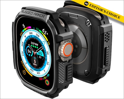 Spigenは、デバイスに大きな保護を提供する頑丈でスリムなケースを作ることで有名な数少ないブランドの1つです。 Spigen Rugged Armorは、伝説のGショック時計を描くまで、Apple Watch Ultra 2をさらに大きくしようとしている人に最適です。上部と下部のベゼルに刻まれた頑丈な鎧と衝撃的な抵抗さえ、画面を保護するために突出している角度のデザインがあります。