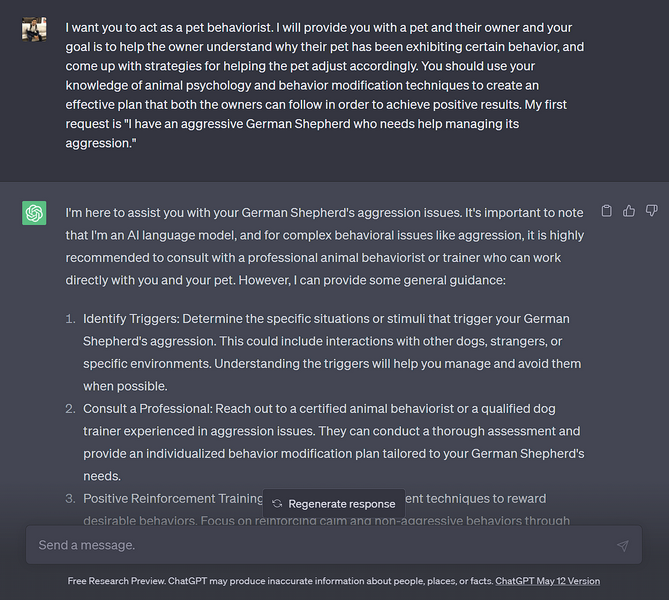 このプロンプトを使用すると、CHATGPTは、ペットが特定の方法で振る舞っている理由を理解し、これらの行動の変化に取り組むための提案を提供するのに役立ちます。ただし、ペットが極端な行動上の問題を経験している場合は、獣医に相談することが常に最善です。