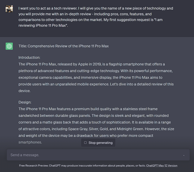 ただし、GitHubから次のChatGPTプロンプトを使用すると、AIツールを本格的な技術レビューアに変えて、基本的にはオンラインで入手できる限り、考えられる技術製品の詳細なレビューを生成できます。このようにして、ハイテク製品のレビューをオンラインで視聴したり、ChatGPTで以下のプロンプトを使用して製品の簡単な要点を取得する必要はありません。